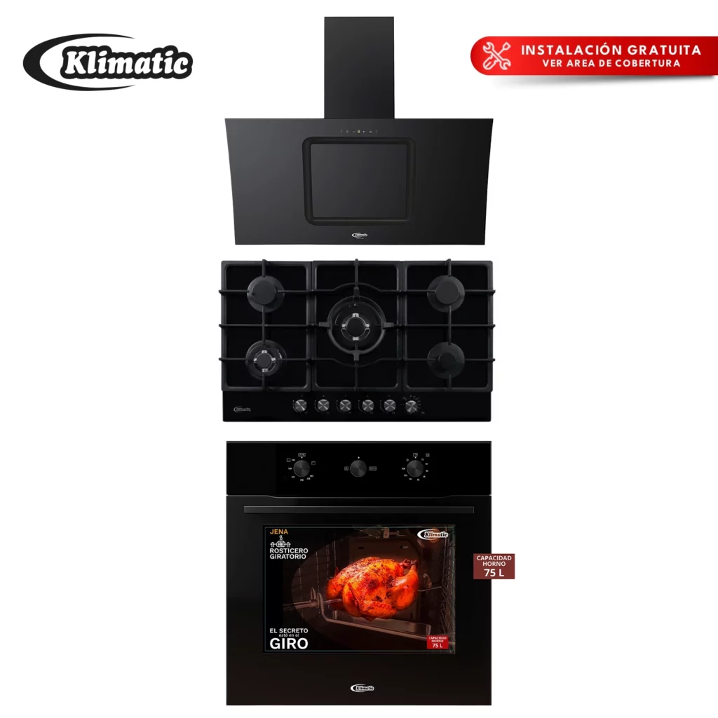 Tricombo Klimatic Cocina Empotrable a Gas Aosta 90 + Campana Extractora Kamba 90 + Horno a gas Jenna