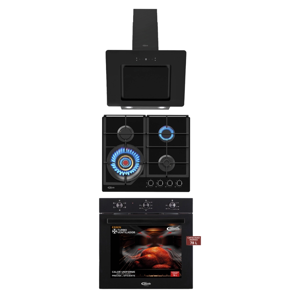 Tricombo Klimatic Cocina Empotrable a Gas Vulcano 4 + Campana Extractora Amsterdam Black + Horno a Gas Jenna
